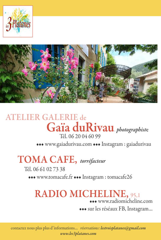 L’association les 3 Platanes, basée sur Nyons, organise pour le 11 iéme année, un Parcours des ateliers d’Artistes et d’Artisans à Nyons. Samedi 13 & Dimanche 14 Septembre 2025. 15 ateliers…